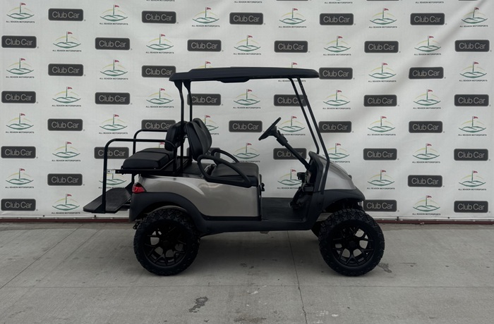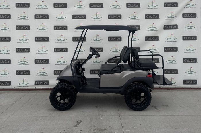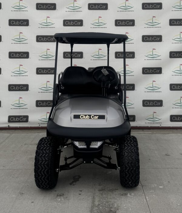 This cart is in the color Metallic Platinum with used Standard Black Seats with a 14″ Custom Wheels and Light Kit!