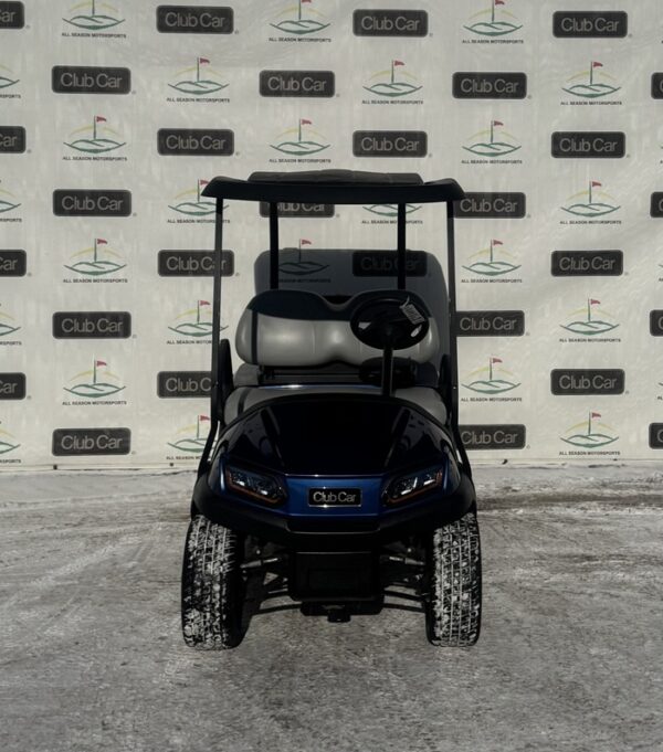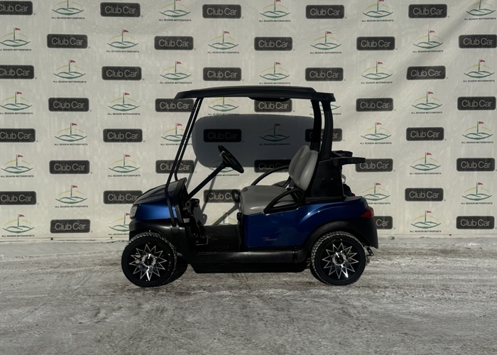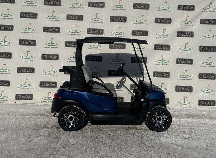 This cart is in the color Metallic Sapphire Blue with Standard Grey Seats with 12″ Athena Wheels!