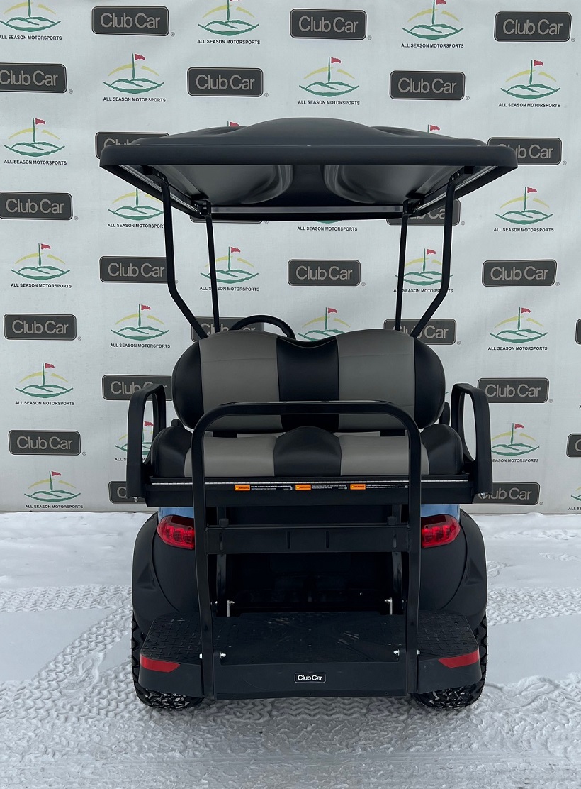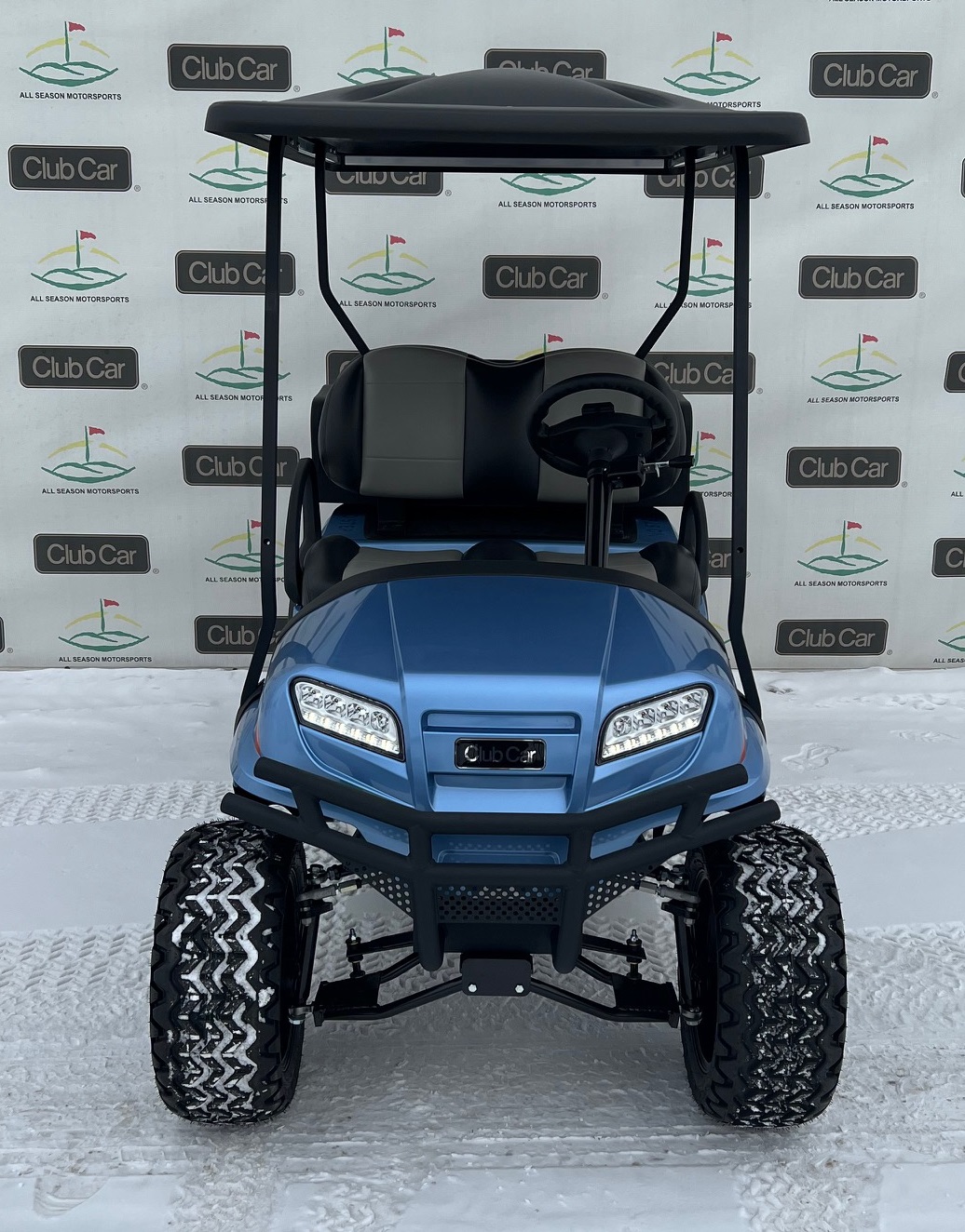 This cart is in the color Metallic Ice Blue with Premium Black & Grey Seats and 14 Inch Mercury Wheels! This cart also includes headlights, taillights, blinker, horn, fuel gauge, hour meter, USB port!