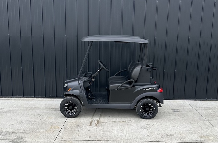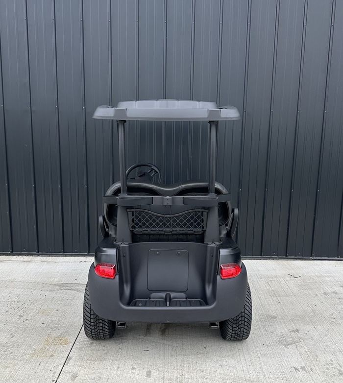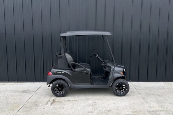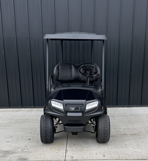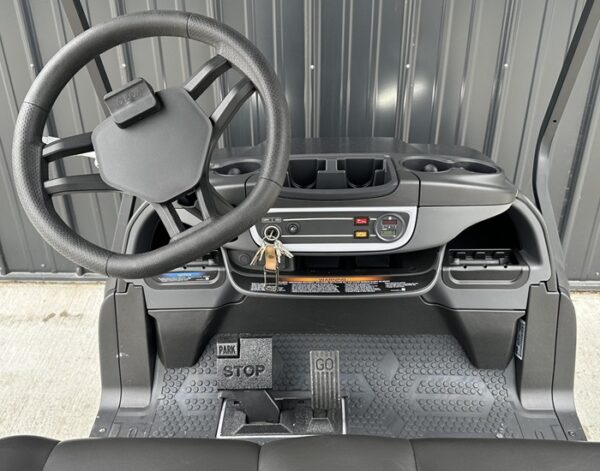 This cart comes in beautiful Metallic Matte Black, shown with Club Car’s Black Premium Seats, and 12 Inch Custom Rims! This cart also features headlights, taillights, blinker, horn, fuel gauge, hour meter, USB ports, wireless charging pad, cell phone storage.