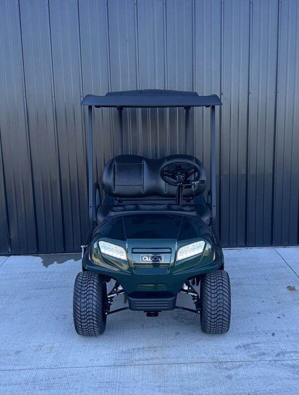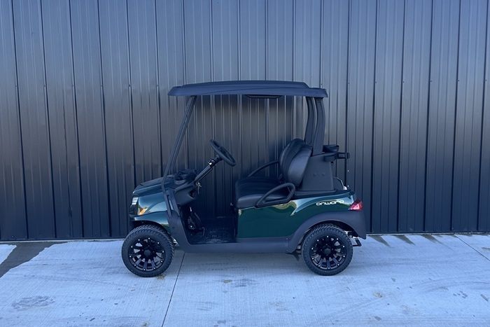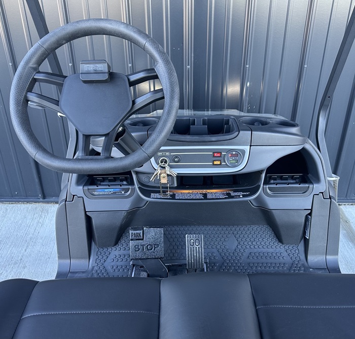 This cart comes in beautiful Metallic Jade Green, shown with Club Car’s Black Premium Seats, and 12 Inch Custom Rims! This cart also features headlights, taillights, blinker, horn, fuel gauge, hour meter, USB ports, wireless charging pad, cell phone storage.