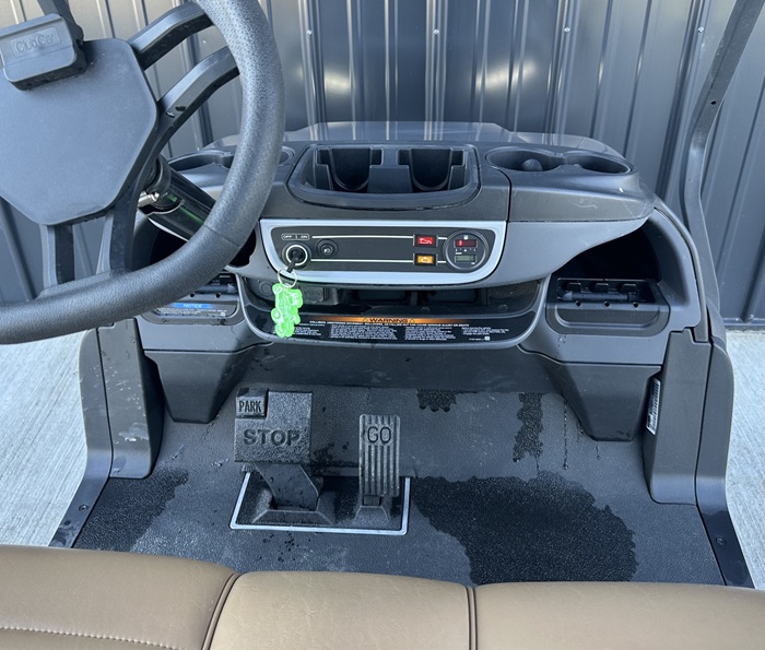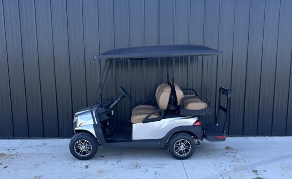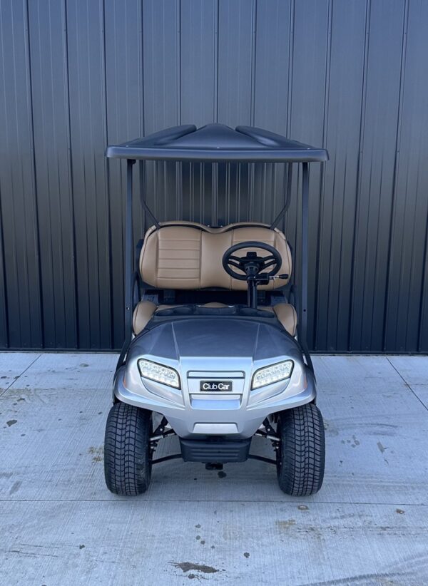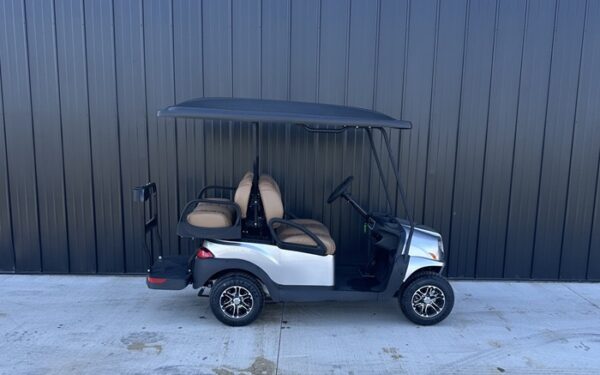 This cart is in the color Signature Silver with Premium Camello Seats and 10 Inch Mercury Rims! This cart also includes headlights, taillights, blinker, horn, fuel gauge, hour meter, USB port, mirrors, cup holders, under seat storage, wireless phone charger, and upper cell phone storage!
