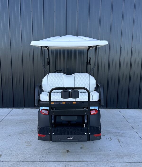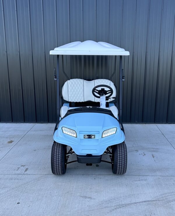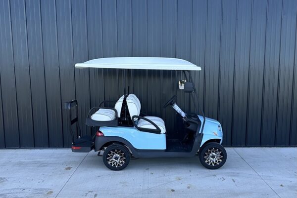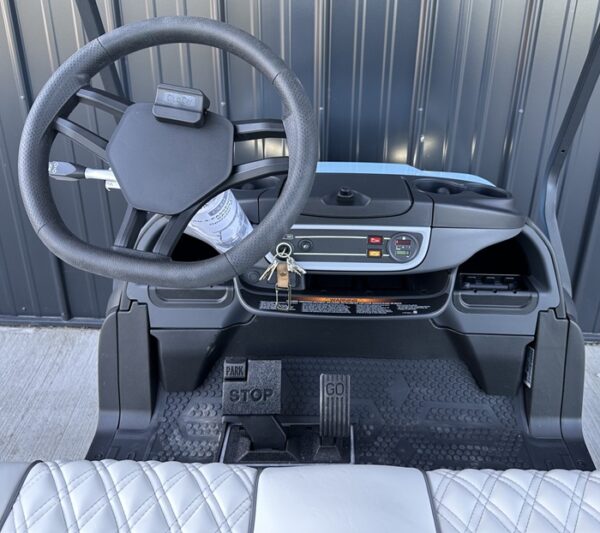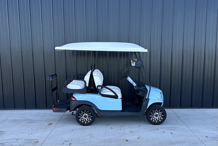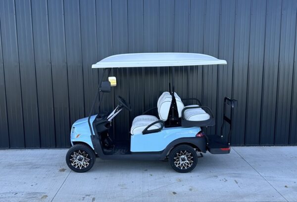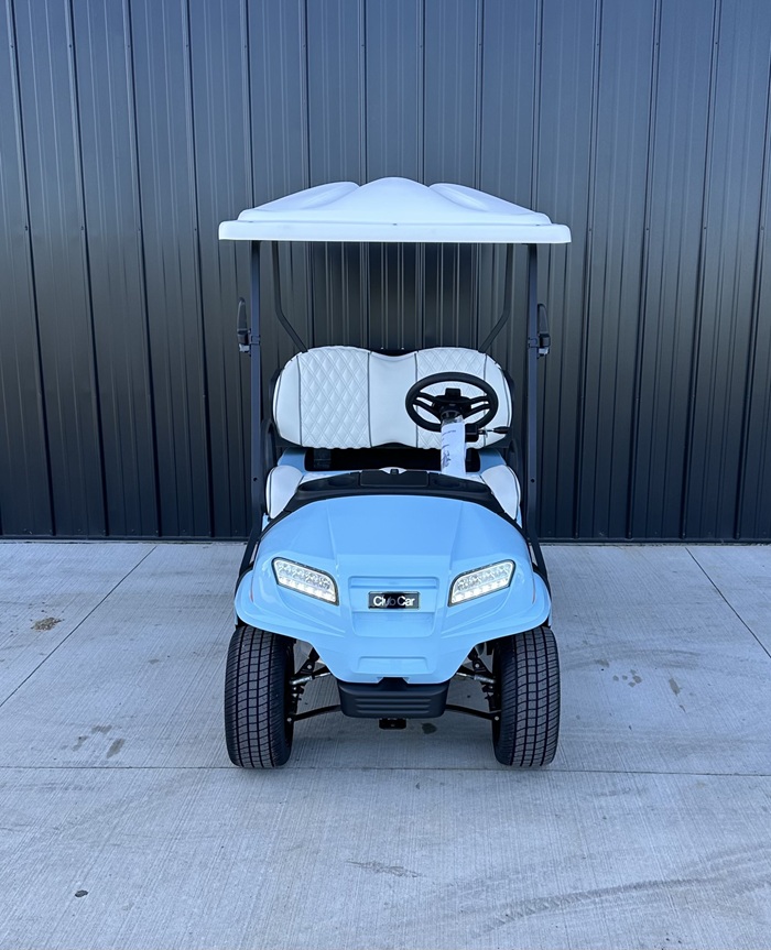 This cart is in the color Heritage Blue with Premium Elite Bright White Seats and 12 Inch Athena Black Machined Rims! This cart also includes headlights, taillights, blinker, horn, fuel gauge, hour meter, USB port, mirrors, cup holders, under seat storage, wireless phone charger, and upper lockable storage!
