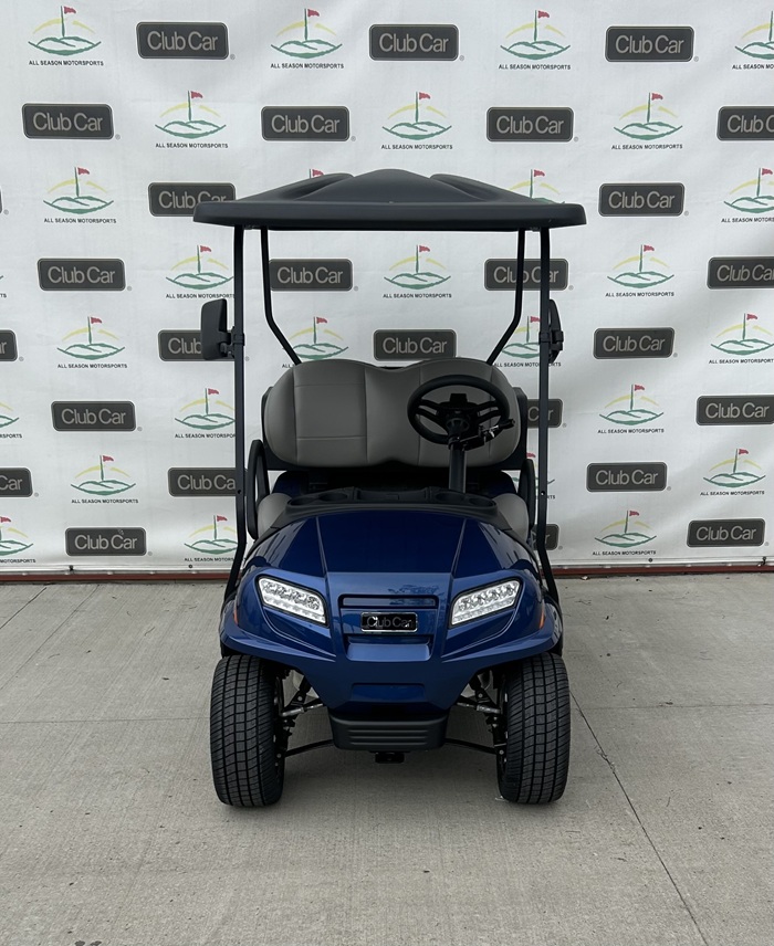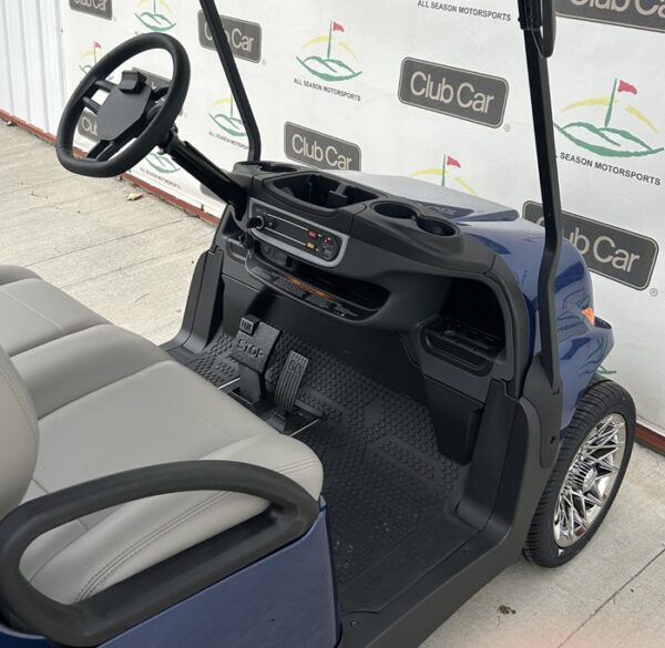 This cart is in the color Sapphire Blue with Premium Grey Seats and 12 Inch Athena Chrome Rims! This cart also includes headlights, taillights, blinker, horn, fuel gauge, hour meter, USB port, mirrors, cup holders, under seat storage, wireless phone charger, and upper cell phone storage!