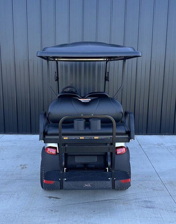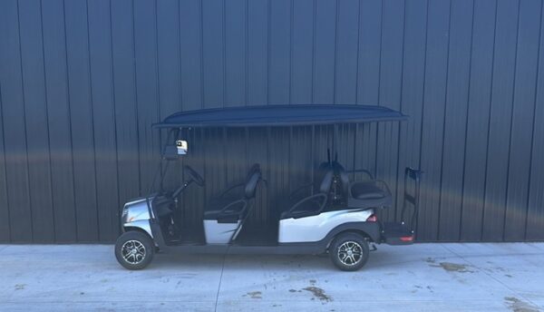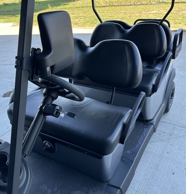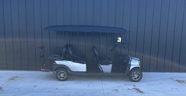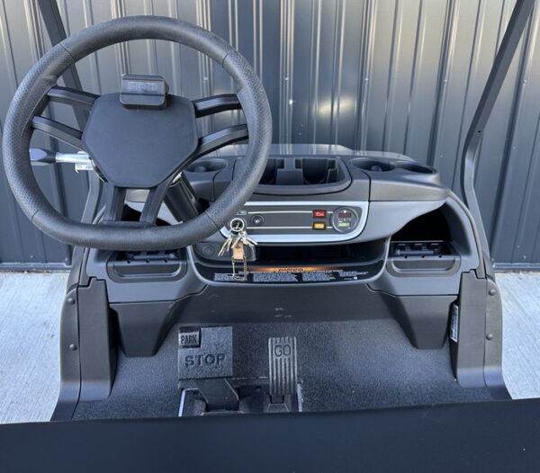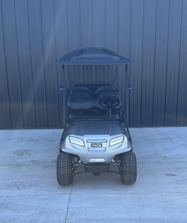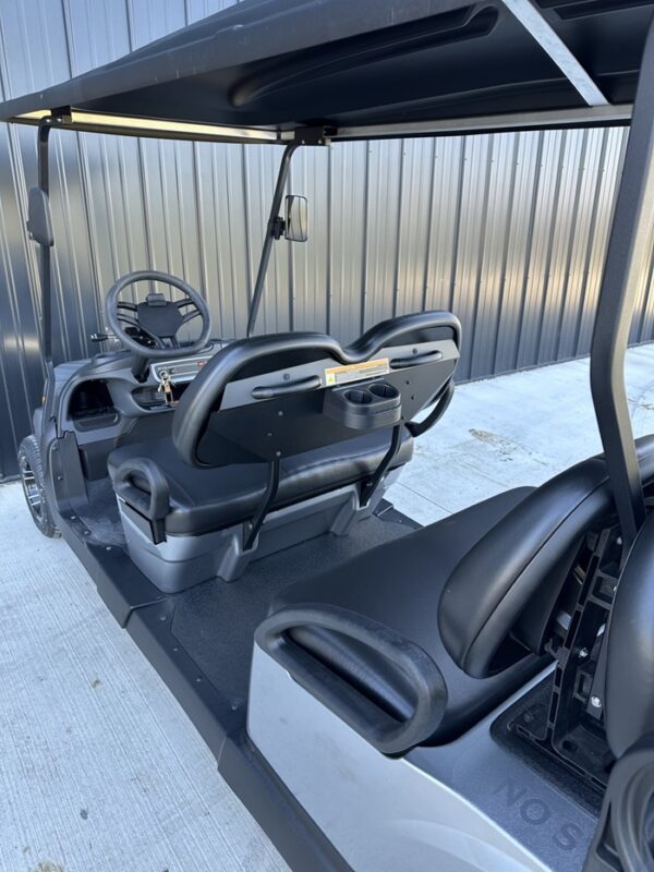 This cart is in the color Metallic Signature Silver with Standard Black Seats and 10 Inch Mercury Rims! This cart also includes headlights, taillights, blinker, horn, fuel gauge, hour meter, USB port, mirrors, cup holders, under seat storage, cell phone holder, and wireless charging pads!